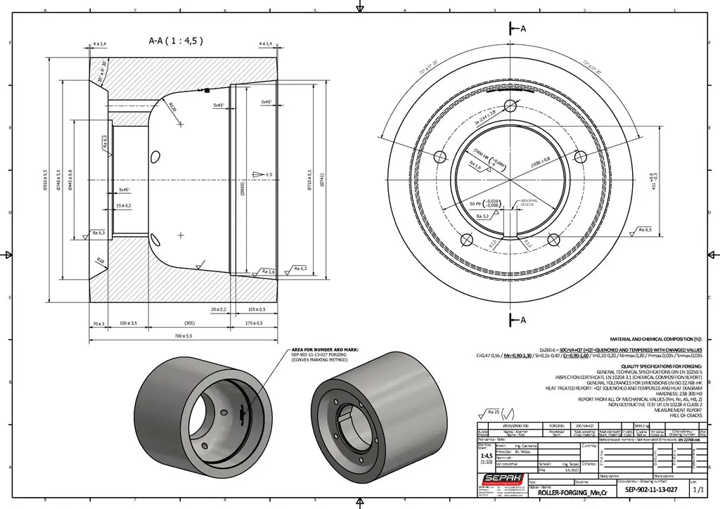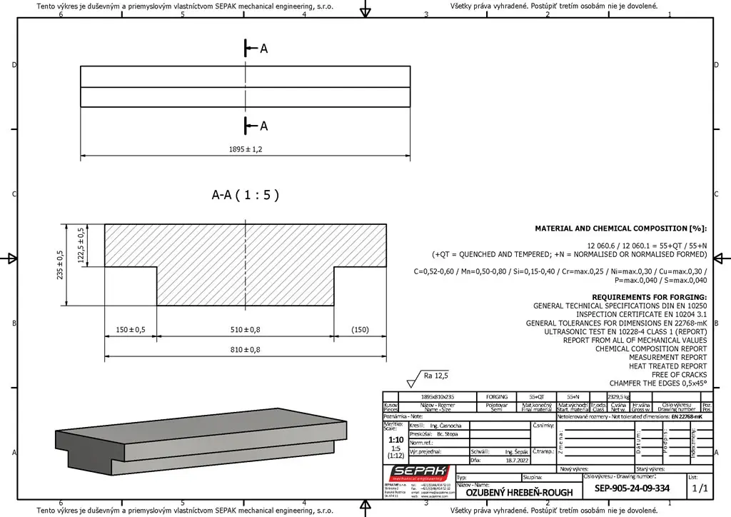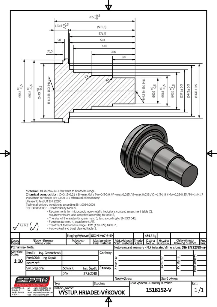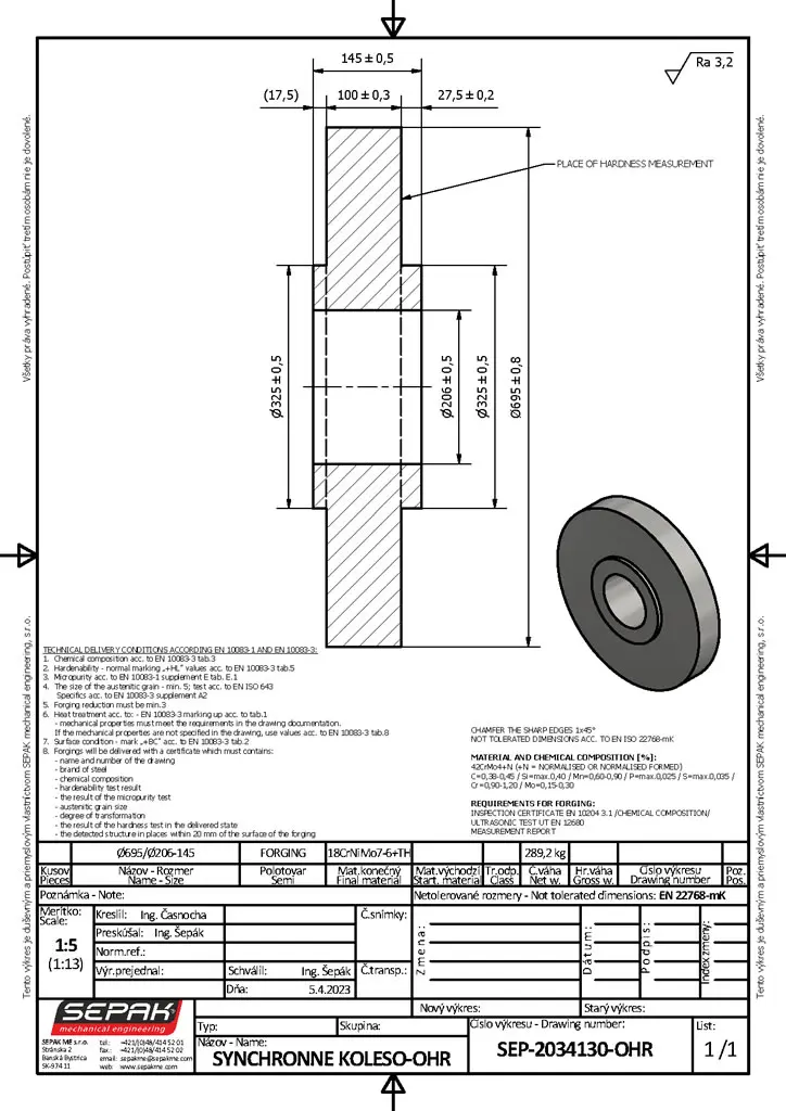Dodávame rôzne výkovky podľa nami prekreslených výkresov s požadovanými mechanickými vlastnosťami doloženými požadovanou dokumentáciou: chemické zloženie s mechanickými vlastnosťami, protokoly o meraní, UT protokoly podľa zadania – výkovky, ktoré môžete použiť vo vašej existujúcej alebo úplne novej technologickej linke.